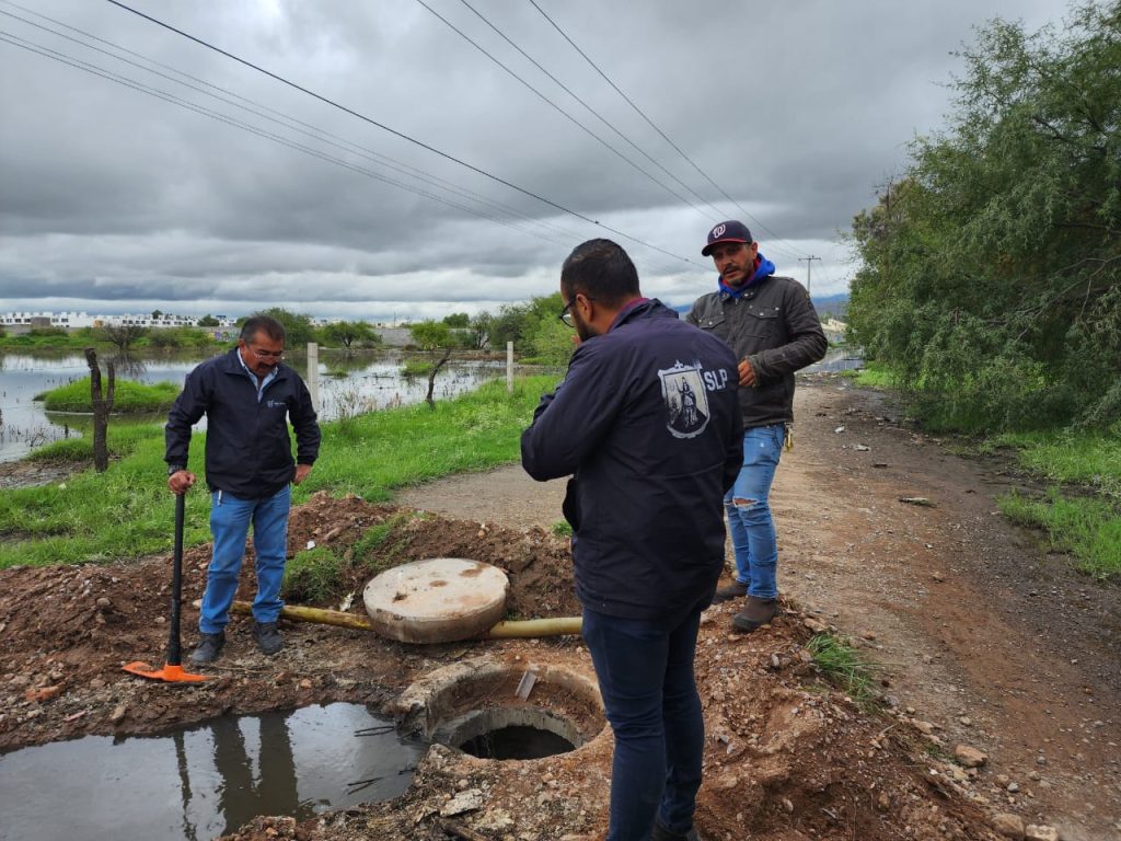 Atendiendo la instrucción del Presidente Municipal Enrique Galindo Ceballos, personal de Interapas se avocó a atender la zona y determinar los motivos de los encharcamientos y ubicar posibles colapsos en el drenaje.