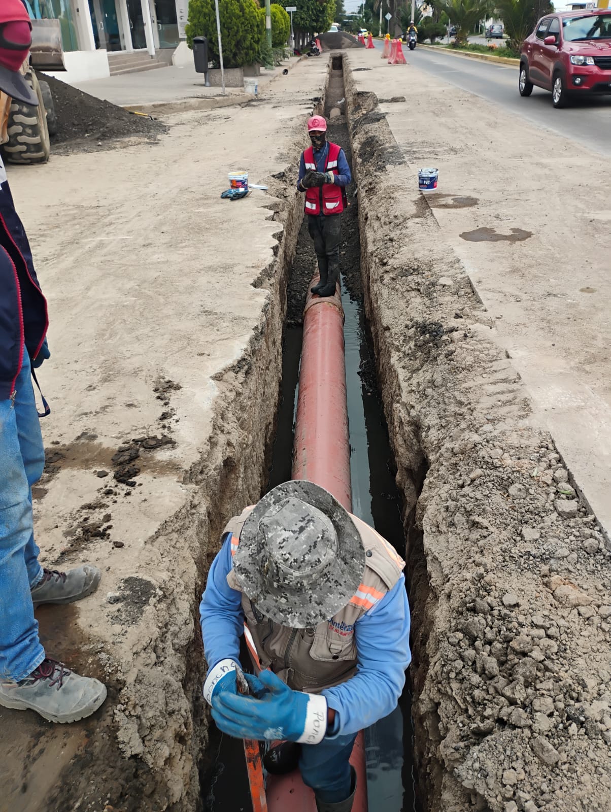 En este punto se localizó un colapso en el drenaje y en colaboración con la dirección de Obras Públicas del Ayuntamiento de la Capital, se inició la reposición de 120 metros de drenaje sanitario.
