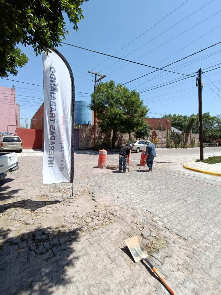 La reposición sanitaria se realiza entre las calles Jorge Ferretiz y Teodoro Torres, donde anteriormente se había atendido el reporte de un bache. Allí, personal de INTERAPAS detectó el colapso del drenaje.