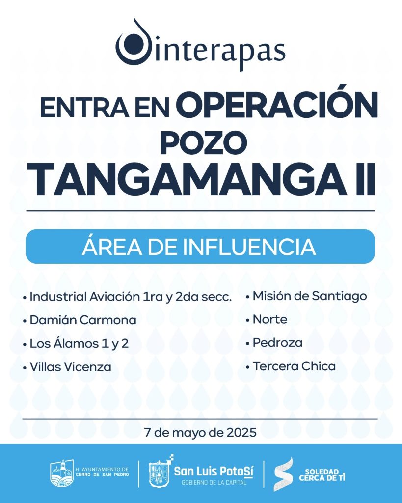 SLP.- Luego de los trabajos de instalación de un nuevo equipo de bombeo, el Pozo Tangamanga ll volvió a operar, permitiendo restablecer el suministro de agua a través de la red en las colonias Industrial Aviación 1ra y 2da sección, Damián Carmona, Los Álamos 1 y 2, Villas Vicenza, Misión De Santiago, Norte, Pedroza y Tercera Chica.