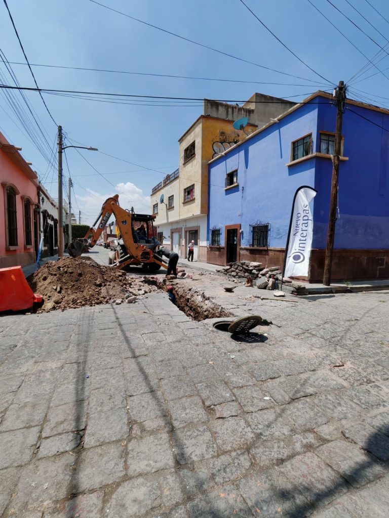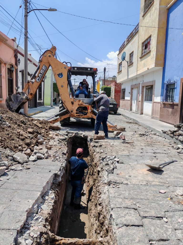 SLP.– Como parte del programa permanente de rehabilitación sanitaria en la zona metropolitana, INTERAPAS inició la reposición de la red de drenaje en la calle Antonio Plaza, entre Eulalio González y Miguel Domínguez, en el Centro Histórico.