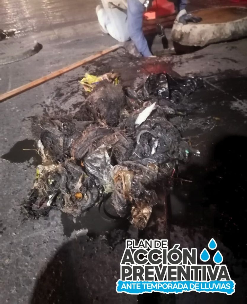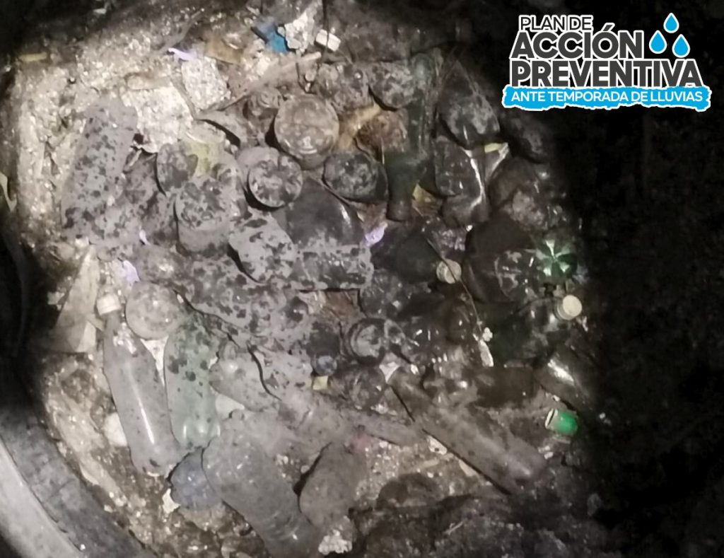 SLP.- En jornada nocturna de limpieza y como parte de las acciones del Plan de Acción Preventiva ante Temporada de Lluvias, personal de Atención a Drenajes extrajo al menos 120 kilos de botellas de plástico y otros desechos de las alcantarillas del cruce de la avenida Reforma y Cuauhtémoc, en el Centro Histórico.