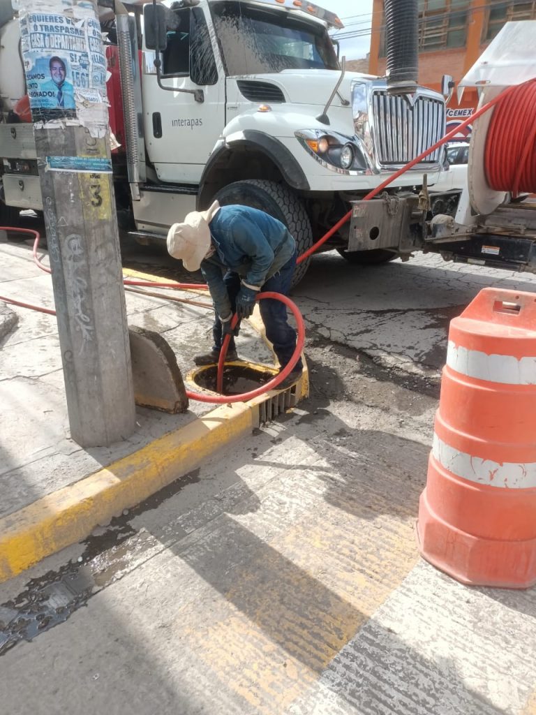SLP.- Durante la actual temporada de lluvias, INTERAPAS mantiene activos los trabajos de limpieza y desazolve preventivo para evitar taponamientos en la red sanitaria y reducir el riesgo de fugas y brotes de aguas residuales.
