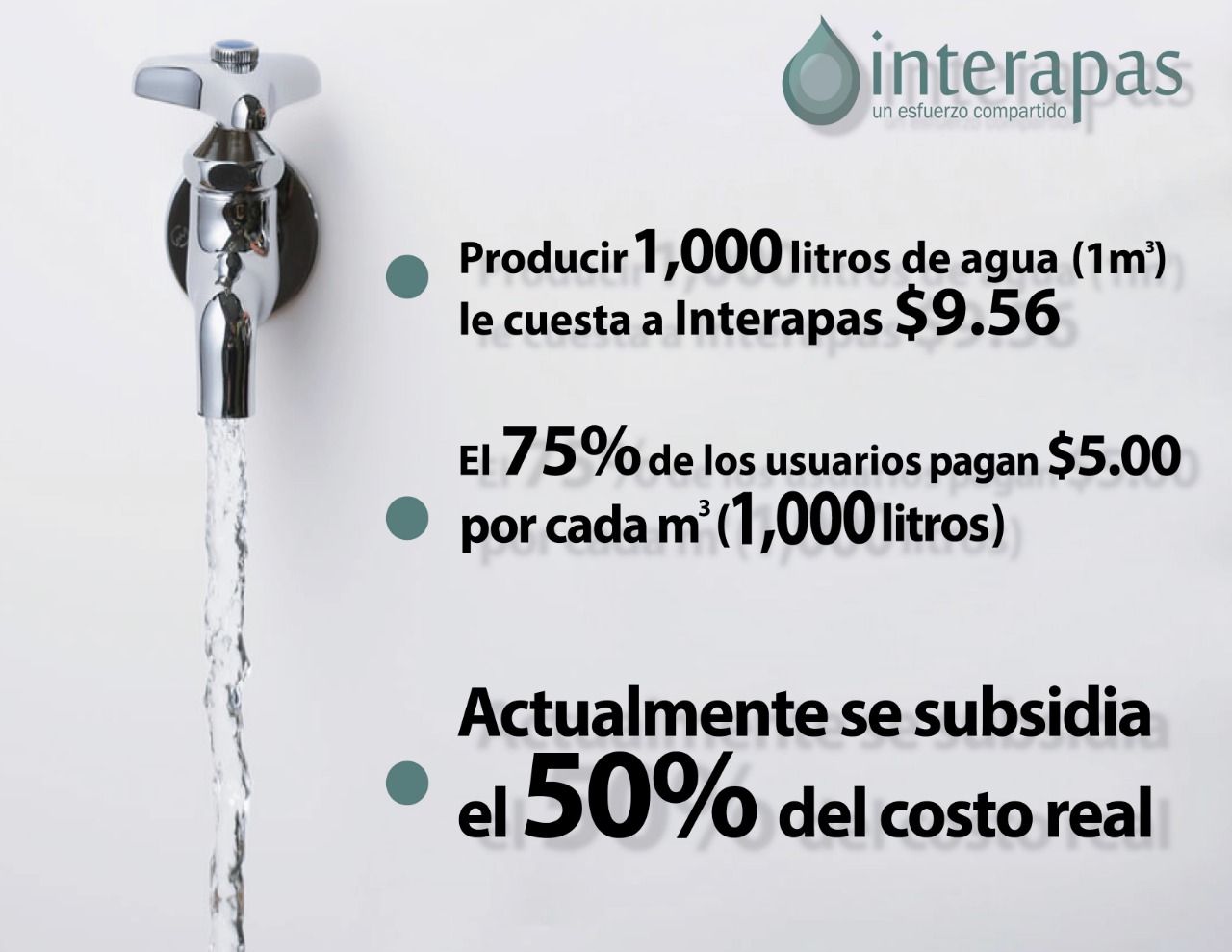 - Mientras que al organismo operador Interapas le representa producir 1 metro cúbico (1,000 litros) a $9.56 pesos.