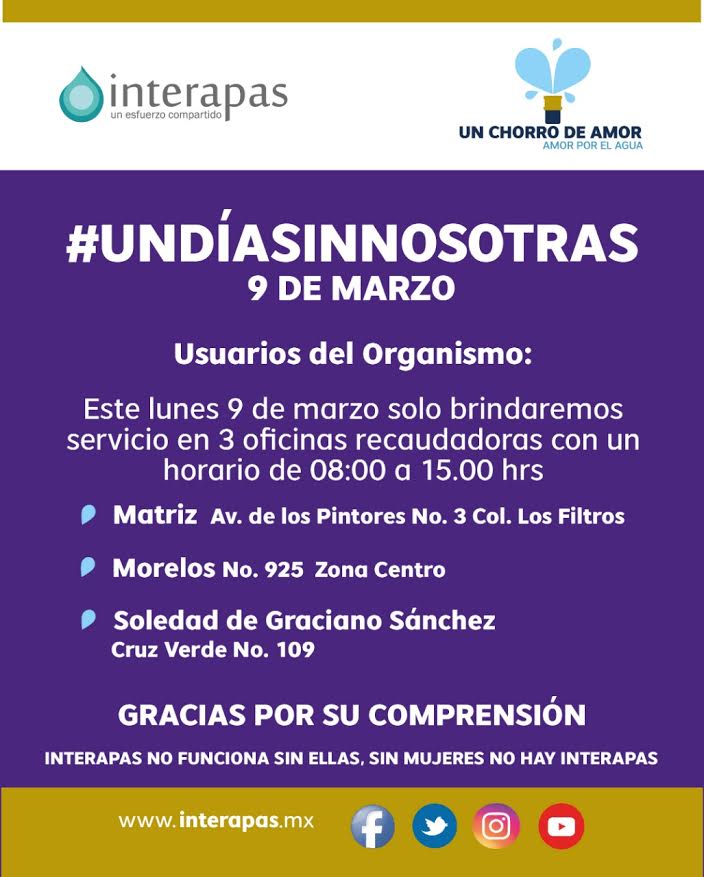 Debido a la ausencia de las compañeras que han decidido sumarse al Movimiento durante el próximo 09 de marzo, Interapas mantendrá puertas abiertas solamente en tres oficinas; Matriz ubicada en planta Los Filtros en Avenida de los Pintores No.3, oficina Centro, en calle Morelos No. 925 y en calle Cruz Verde No.105 en Soledad de Graciano Sánchez.