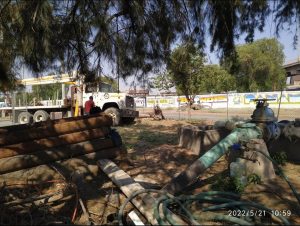 El fin de semana después de anunciarse que el pozo requería intervención urgente para realizar maniobras de “pesca” del equipo de bombeo a 400 metros de profundidad, en colaboración con la Comisión Estatal del Agua se utilizó una grúa para el proceso de sustracción de los tramos de la bomba que obstruye el paso del agua.