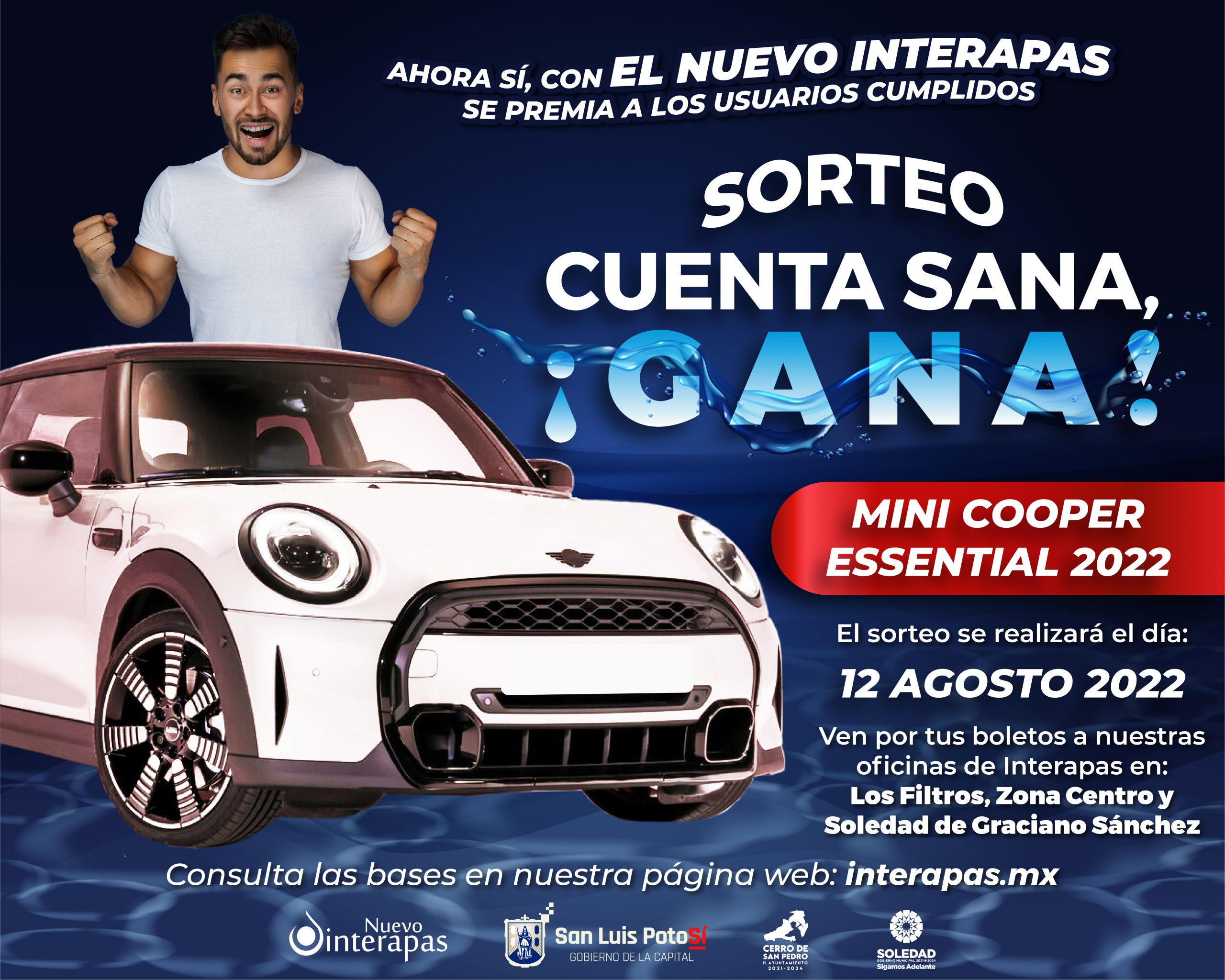 SLP.- Con el propósito de premiar a los usuarios que hayan realizado puntualmente sus pagos por los servicios de agua potable, alcantarillado y saneamiento durante todo el año 2021, el Organismo Operador Interapas anunció su sorteo “Cuenta Sana, Gana”, en el que se rifará un vehículo Mini Cooper 2022.