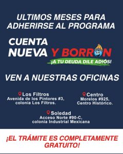 SLP.- El Nuevo Interapas relanzó la invitación a la población para adherirse al programa “Cuenta Nueva y Borrón” y ponerse al corriente en sus pagos por el servicio de agua. El beneficio para usuarios morosos tendrá vigencia sólo hasta el 31 de diciembre del 2022.