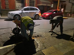 SLP.-  Cuadrillas de bacheo y atención a drenajes realizaron la madrugada de este viernes una intensa jornada de rehabilitación en calles del Centro Histórico, como parte del mantenimiento preventivo, para que el primer cuadro de la ciudad luzca en todo su esplendor durante las celebraciones de Día de Muertos.