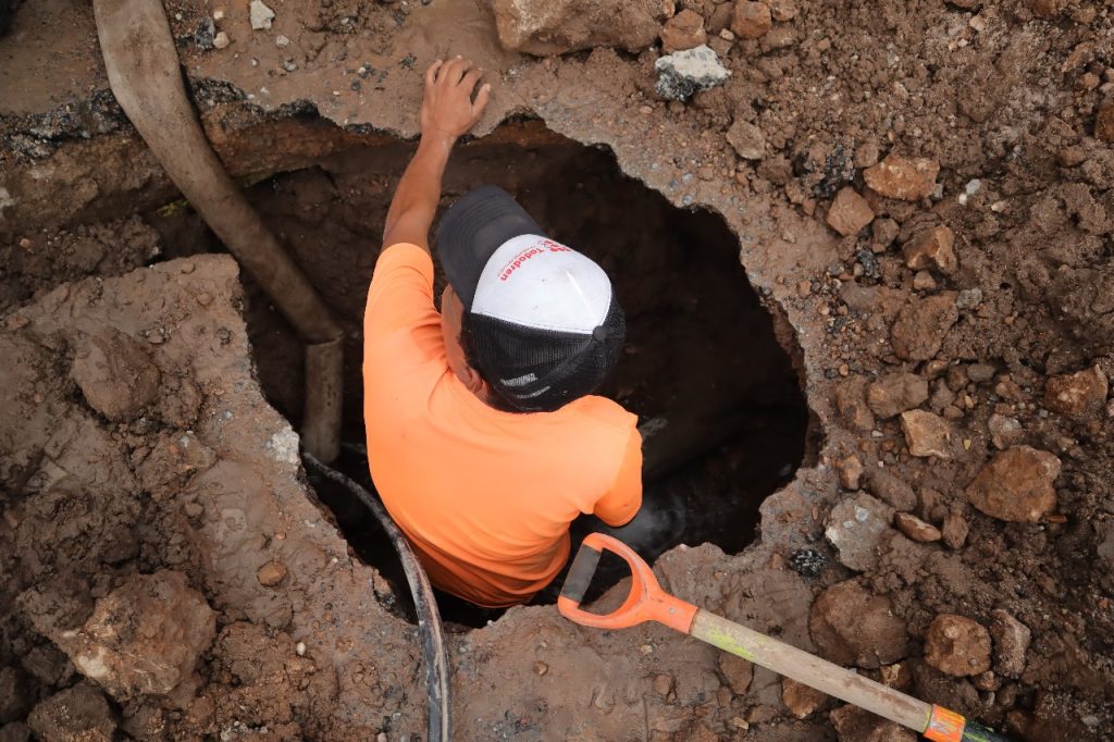 Se trataba de una fuga interna que se detectó por el hundimiento del pavimento sobre la calle de Chapala. Al inspeccionar la zona y excavar, el equipo de plomeros tuvo a la vista el rompimiento del ducto de 6 pulgada de diámetro.