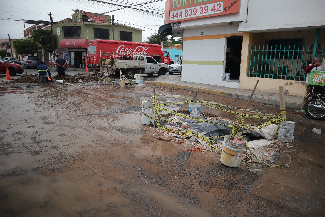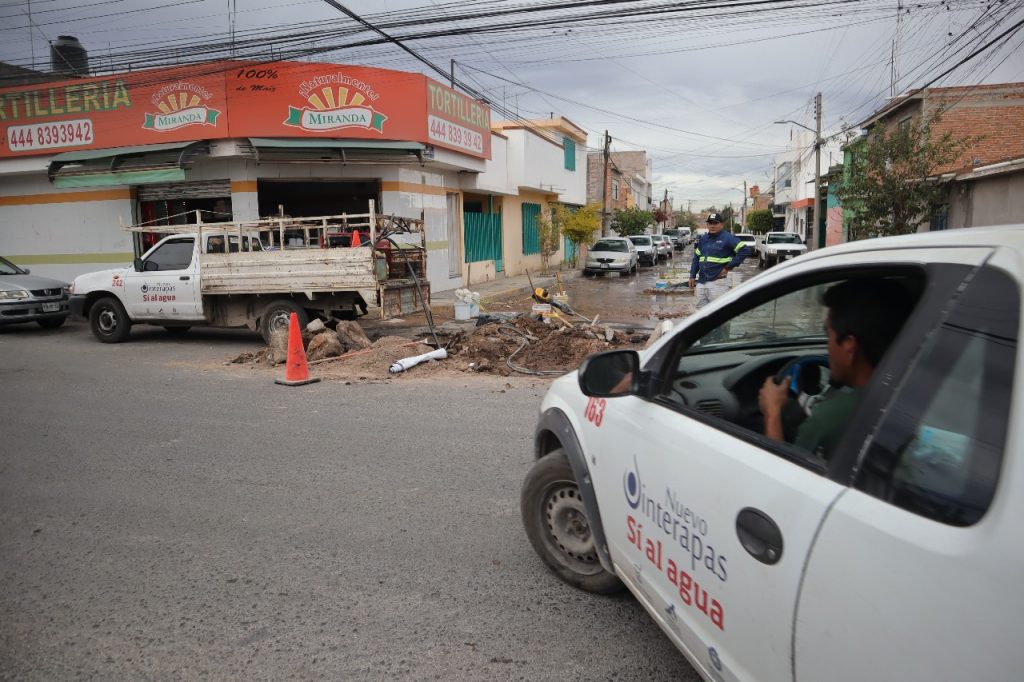 SLP.- Una importante fuga en calles de la colonia San Luis Rey, fue reparada por plomeros especializados del Nuevo Interapas realizando de inmediato el seccionamiento de la red, para evitar el desperdicio.